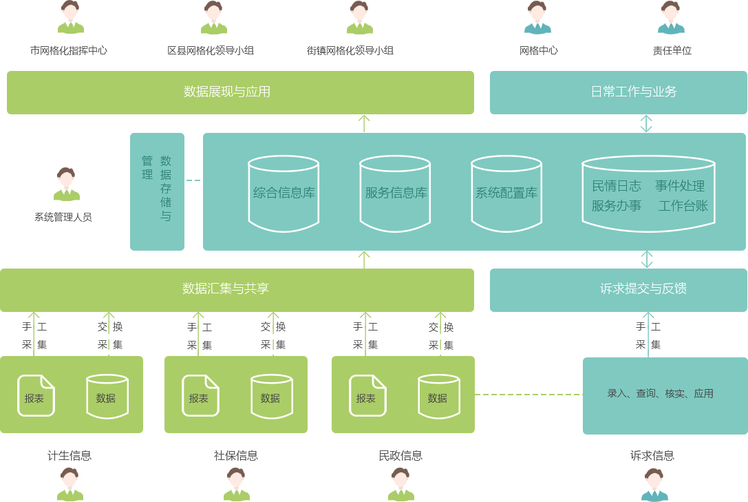 構(gòu)建社會(huì)管理綜合信息指標(biāo)體系,采集基層各社會(huì)管理數(shù)據(jù),匯聚整合各職能部門數(shù)據(jù),實(shí)現(xiàn)主要管控重點(diǎn)人口、流動(dòng)人口、重點(diǎn)組織、重點(diǎn)場所等社會(huì)管理數(shù)據(jù)的信息資源數(shù)據(jù)庫建設(shè)。
