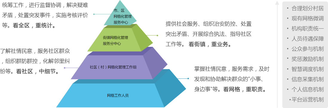 網(wǎng)格化社區(qū)綜合管理平臺(tái)運(yùn)用大數(shù)據(jù)和移動(dòng)互聯(lián)技術(shù),對(duì)網(wǎng)格內(nèi)的人、地、事、物、情、組織的六大基本要素進(jìn)行全面的采集和管理。將數(shù)據(jù)進(jìn)行處理,使靜態(tài)數(shù)據(jù)變成動(dòng)態(tài)數(shù)據(jù),將數(shù)據(jù)變得可視化、精細(xì)化,共享到職能部門提供支持。推進(jìn)資源整合、綜合研判、指揮調(diào)度、綜合執(zhí)法、聯(lián)勤聯(lián)動(dòng)、考核督辦、系統(tǒng)運(yùn)維等工作機(jī)制高效運(yùn)轉(zhuǎn)。